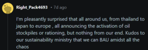 “I’m pleasantly surprised that all around us, from thailand to japan to europe, all announcing the activation of oil stockpiles or rationing, but nothing from our end. Kudos to our sustainability ministry that we can BAU amidst all the chaos”