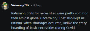 “Rationing drills for necessities were pretty common then amidst global uncertainty. That also kept us rational when shortages occurred, unlike the crazy hoarding of basic necessities during Covid.”