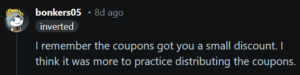 “I remember the coupons got you a small discount. I think it was more to practice distributing the coupons.”