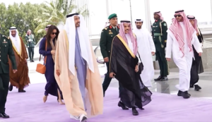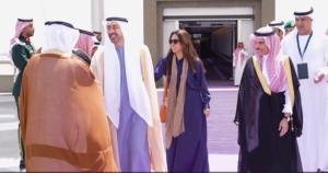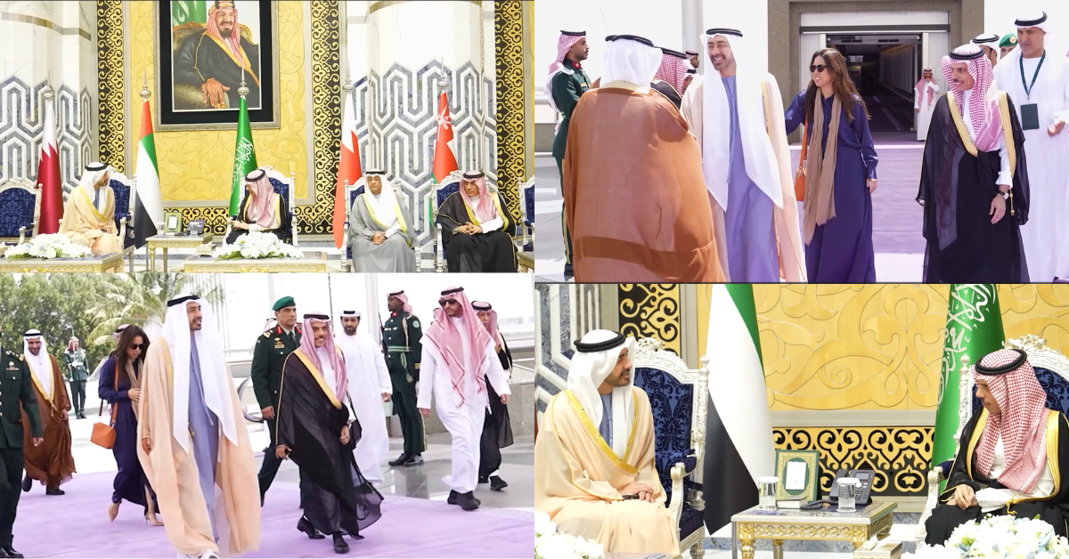 Footage shows Sheikh Abdullah being received by Saudi Foreign Minister Faisal bin Farhan Al Saud, before holding talks alongside delegations from both sides.