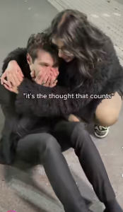 When the balloon floated away, the man froze and collapsed to the ground, covering his face. His girlfriend knelt beside him and said, “It’s the thought that counts.”