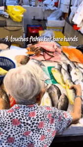 She gets shocked at prices but buys anyway, smells every vegetable, and even touches fish with her bare hands to check freshness — something that would make younger shoppers hesitate.