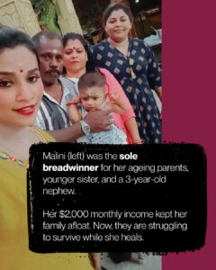 Now, with months of rehabilitation ahead and no income or savings, her family is struggling to survive. Malini’s sister, who is a homemaker and single mother, has been caring for their parents and child while managing mounting expenses.