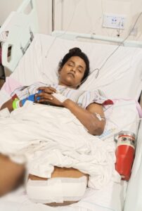 Malini was rushed to hospital with severe injuries. Her left leg was amputated, and she suffered multiple rib fractures and deep wounds. She now faces one more critical surgery on her right foot to repair a serious injury and begin her long road to recovery.