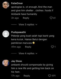 Others felt that, not only expressing regret, but that if the bank wanted to prove its humanity, it should provide shelter, clothing, and food for the person. Some reactions also said that AmBank should help the homeless person rebuild his life as compensation.