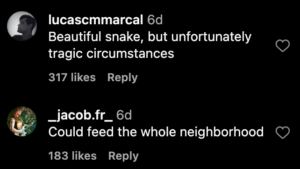 Some expressed regret that the snake was beautiful and that it had unfortunately washed up in a residential area. Others joked that such a large snake could become food for the entire neighborhood.