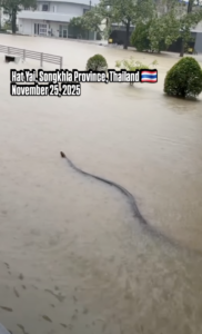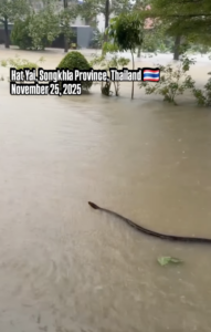 The severe flooding caused by continuous heavy rains in southern Thailand has created a more complicated situation. A video of a huge snake slowly swimming through waist-deep water has gone viral on social media amid the concerns of people trapped in the water.
