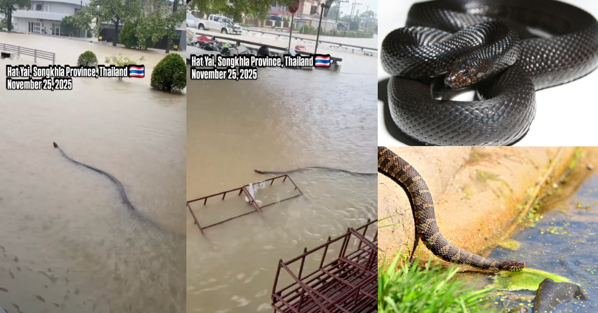The severe flooding caused by continuous heavy rains in southern Thailand has created a more complicated situation. A video of a huge snake slowly swimming through waist-deep water has gone viral on social media amid the concerns of people trapped in the water.