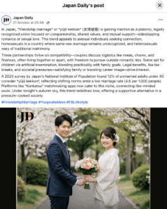 Many call it a pragmatic adaptation to modern Japanese society, where marriage is no longer about love but rather a joint agreement of mutual respect and responsibility.