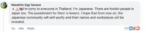 After the incident went viral, Thai social media was abuzz with outrage. Many commented that the Japanese’s ‘civilized’ image had been proven false.