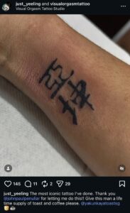 She even shared a picture of the tattoo to her page, captioned, ‘The most iconic tattoo I’ve done. Thank you @johnpaulpenuliar for letting me do this!! Give this man a life time supply of toast and coffee please. @yakunkayatoastsg 🍞☕’