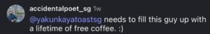 One commenter joked that Ya Kun should give him a lifetime of free coffee, while another said his tattoo was basically “Ya Kun in your blood.”