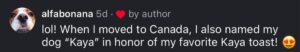 Others chimed in with their own obsessions — iced soya milk coffee, steamed bread, and even someone naming their dog “Kaya” abroad.