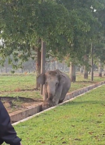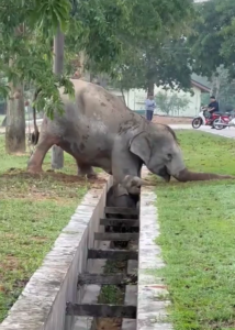The calf struggled to climb out, but the walls were too steep. The mother elephant stayed nearby and did not leave. She moved in and out of the drain area, trying different ways to help her baby escape.