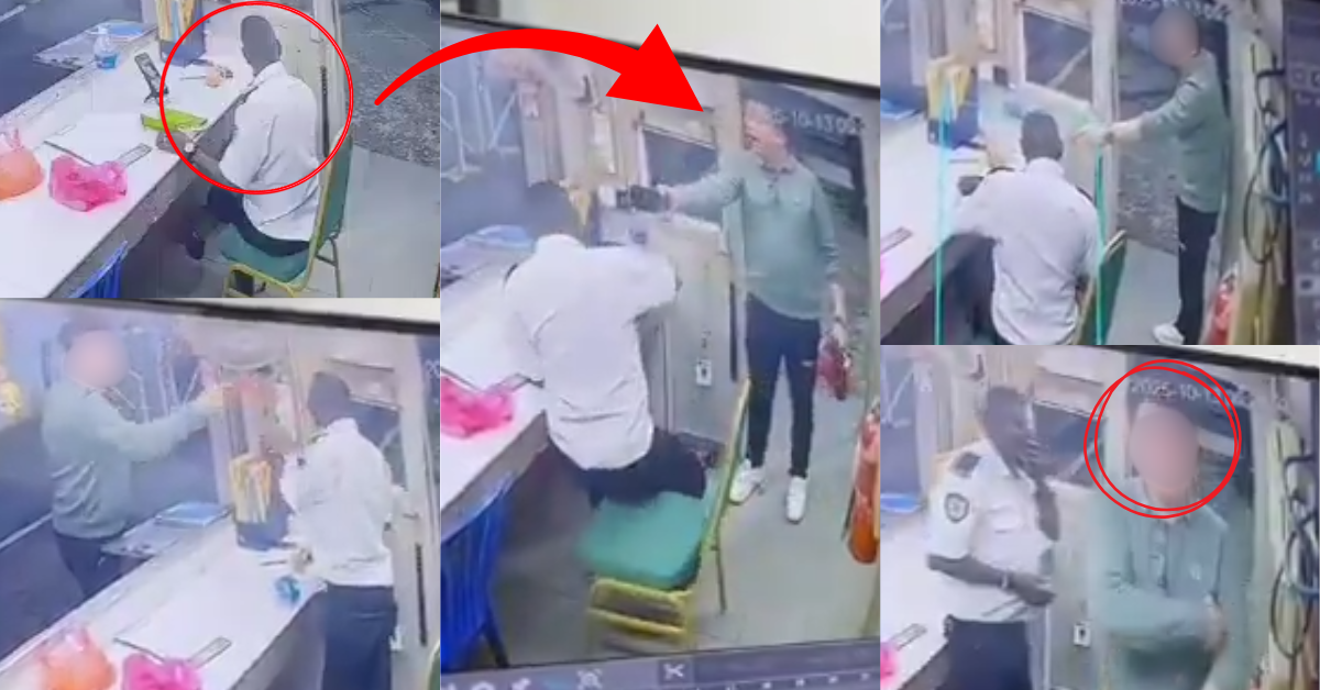 A viral video shows a man angrily berating, kicking, and shoving the guard, who remained seated at his post and tried to calm the situation. The incident, which took place around 5 a.m., has since sparked public outrage online.