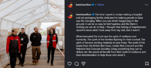 In his visit, Hamilton visited Red Cross, Red Crescent and Palestine Red Crescent teams in Britain and Jordan and Palestine respectively. He was complimenting on how committed and hardworking they are, terming their work to be a source of inspiration. Hamilton says the visit to the ground where the work was going on made him realize the true magnitude of the crisis.
