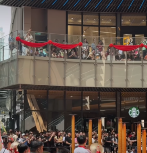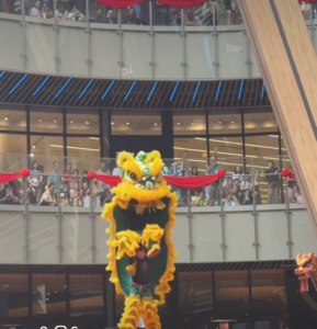 The area of performance is vibrant. Drums are rapping, cymbals are clashing, and gongs are striking in the hall. Every sound directs the movement of the lion. The strong lights illuminate the bright colors of the costumes of the lion, and this scene becomes lively and fast-paced.
