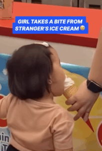 Just then, unbeknownst to everyone, the child, acting sweetly, stepped forward and took a bite of the stranger’s ice cream! The incident was so sudden and unexpected.
