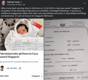 Perhaps the most poignant symbol of the NGO’s impact came in October 2025. A Palestinian soup-kitchen cook in Gaza, Mr Hamdan Hadad, whose wife had been nourished by Love Aid’s kitchen during her pregnancy, named his newborn daughter “Singapore” in gratitude. Born 16 October 2025 and weighing 2.7 kg, the child is reported to be the first Palestinian girl named after the city-state. The father said: “I am happy and I want to name her Singapore because I really love them.”