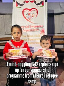 One of LoveAidSG’s signature efforts addresses the plight of children in Gaza. By early 2024 the charity was sponsoring about 400 orphans at US$60 per month each (approximately S$80) covering food, clothing and school supplies.