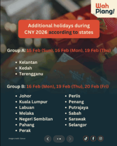 The CNY holidays have been included in the first term of the 2026 academic year. General schools will have additional holidays on February 16, 19 and 20. For Group A schools (Kedah, Kelantan, Terengganu), these three holidays will be on February 15, 16 and 19.