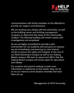 The incident took place at HELP University, which is situated on Jalan Semantan in Bukit Damansara.