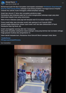 On 26 April, a team of medical experts began the delicate process of retrieving Syukri’s organs and tissues. Because time is a critical factor in organ transplants, the hospital coordinated a fast-paced operation.