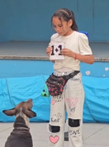 The local group known as Chicas Dog Trainer trains Snoopy. He is involved in basic activities during school visits which combine learning and play. Snoopy responds to the given instructions by jumping or barking when the trainers present number cards. The kids are observing closely, smiling, laughing, as the dog accomplishes every job.