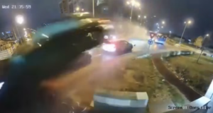 The footage shows that the car was coming so fast that it could not even turn the roundabout. As a result, it hit the central island and soared into the air. It then narrowly avoided colliding with a bus and a camera pole.