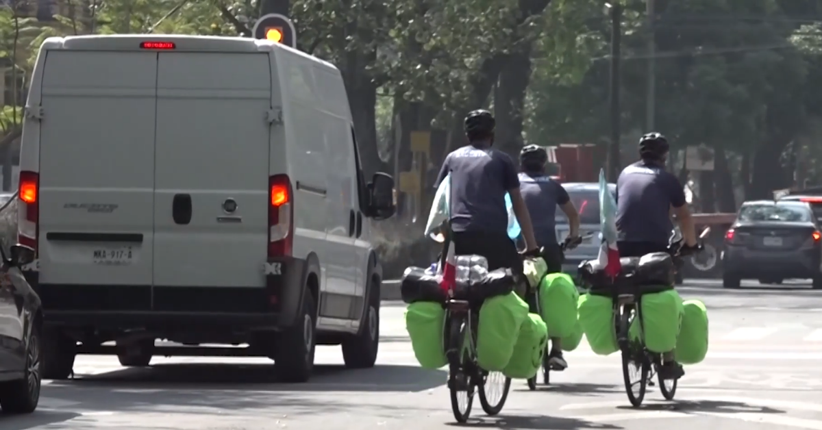 Footage shows the trio cycling through Mexico City, passing landmarks including the Angel of Independence along Paseo de la Reforma.