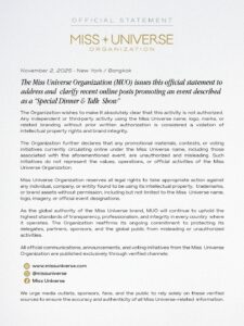 On 2 November 2025, MUO stated that any third-party activities or promotional materials using the Miss Universe logo, marks, or branding without written authorisation are “a violation of intellectual property rights.”