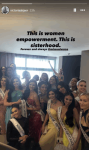 Miss Universe 2024 Victoria Theilvig also expressed support online: “Standing up for yourself is not always easy, but it is one of the most important acts of self-respect and strength you can show… Enough is enough, and our voices will be heard loud and clear!”