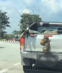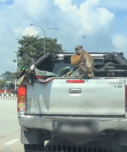 The incident happened when a pickup truck loaded with fresh durians was briefly left unattended, giving the monkey the perfect chance to act.