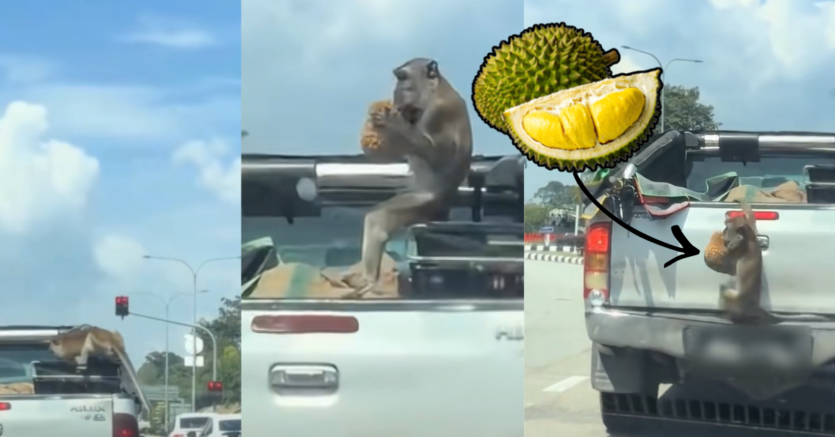 The incident happened when a pickup truck loaded with fresh durians was briefly left unattended, giving the monkey the perfect chance to act.