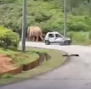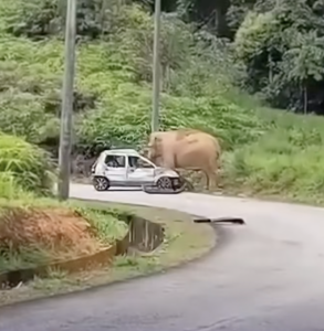 A recent incident on a road in Terengganu, Malaysia, has once again brought to the fore the issue of human-wildlife conflict. In a video recorded on March 24, 2026, a man was mowing grass on the side of the road when an angry elephant vandalized a parked car. It was learned that the baby elephant fell into a drain on the side of the road, and when the mother elephant could not get out of it, she became agitated. In a fit of rage, the elephant attacked the car and tried to get inside.