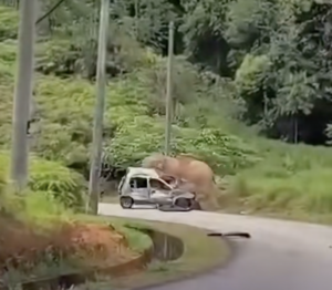 24 March 2026: A tense moment captured on video shows a grass cutter witnessing an angry elephant damaging a car parked by the roadside in Terengganu. The elephant reportedly became aggressive after its calf fell into a roadside drain and could not get out. Thankfully, the car owner was not inside the vehicle and no injuries were reported. In situations like this, keeping a safe distance is the safest option. @thesundaily #theSun #theSunMY #Terengganu #WildlifeEncounter #ViralVideo