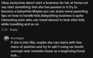 One user suggested exploring home-based work aligned with the daughter’s interests, such as babysitting or starting a small food business. “If she is into F&B, maybe she can start with a few pastries and sell at a Ramadan bazaar,” the commenter wrote.