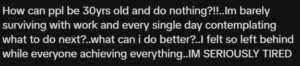 “How can people be 30 and do nothing?” one commenter wrote. “I’m barely surviving with work and every single day thinking what to do better. I feel so left behind… I’m seriously tired.”