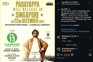 After a long wait, one of the iconic films of Tamil cinema, ‘Padayappa,’ is being released in Singapore cinemas again. The film will be screened at Carnival Cinemas, Golden Mile Tower, from 22 December 2025. With a PG-13 censor, the audience will be able to enjoy the film with their families.
