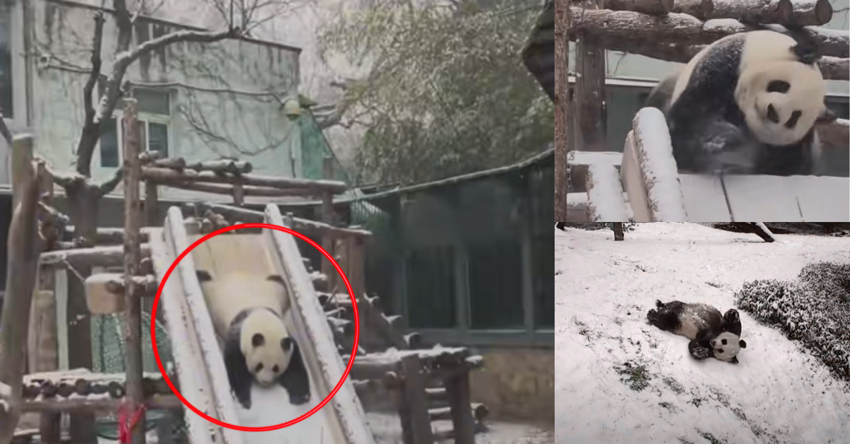 Covered in soft snow, Meng Lan slid down a playground slide, rolled across the ground, and moved around with clear excitement, creating a cheerful scene that quickly caught attention.