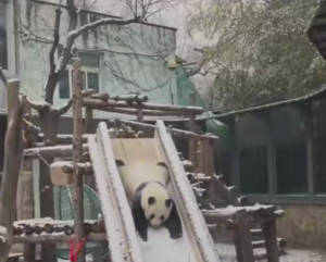 Meng Lan is already well known among zoo visitors for his lively personality. He is often active during the day and enjoys using playground equipment. The first snowfall gave him a new way to express that energy.