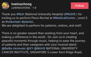 Thank you Nuh (National University Hospital ( NUHS ) for inviting us to perform Piano Recital at MedicalCentre , Level 3 as #volunteer #pianist We are delighted to perform for patients, visitors, friends and staff. #庄洁明 #ThePianoSG There is no greater reward than working from your heart, and making a difference in the world . Do Join us in creating peaceful moments through music, helping to ease the journey of patients and their caregivers with your musical talent.  #NCISTunesOfHope NATIONAL UNIVERSITY CANCER INSTITUTE, SINGAPORE