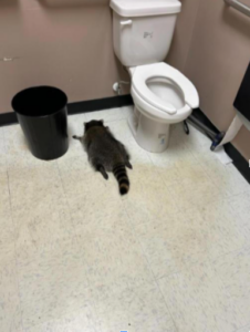 Inside the bathroom, the officer discovered the surprising suspect: a raccoon lying on its back, fast asleep.