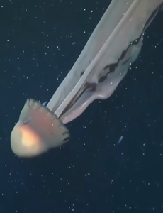 The footage was taken at a depth of about 830 feet, far below where sunlight can reach. The institute’s ROV, named Sebastian , followed the jellyfish as it pulsed gently through the water.