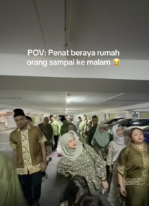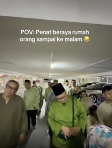 The caption mentions that even though it is night time while celebrating Raya at other people’s homes, they do not feel any regret. Rather, despite their fatigue, there is a bright expression of the joy of the festival and family bond among them.