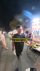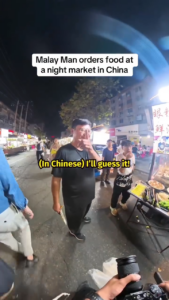 The video begins with him ordering “mutton stick x2, mutton kidney x3” through his phone. The stallkeeper repeats the order to a bespectacled friend, who calculates the price — 34 RMB — before casually asking Rifqi in Mandarin: