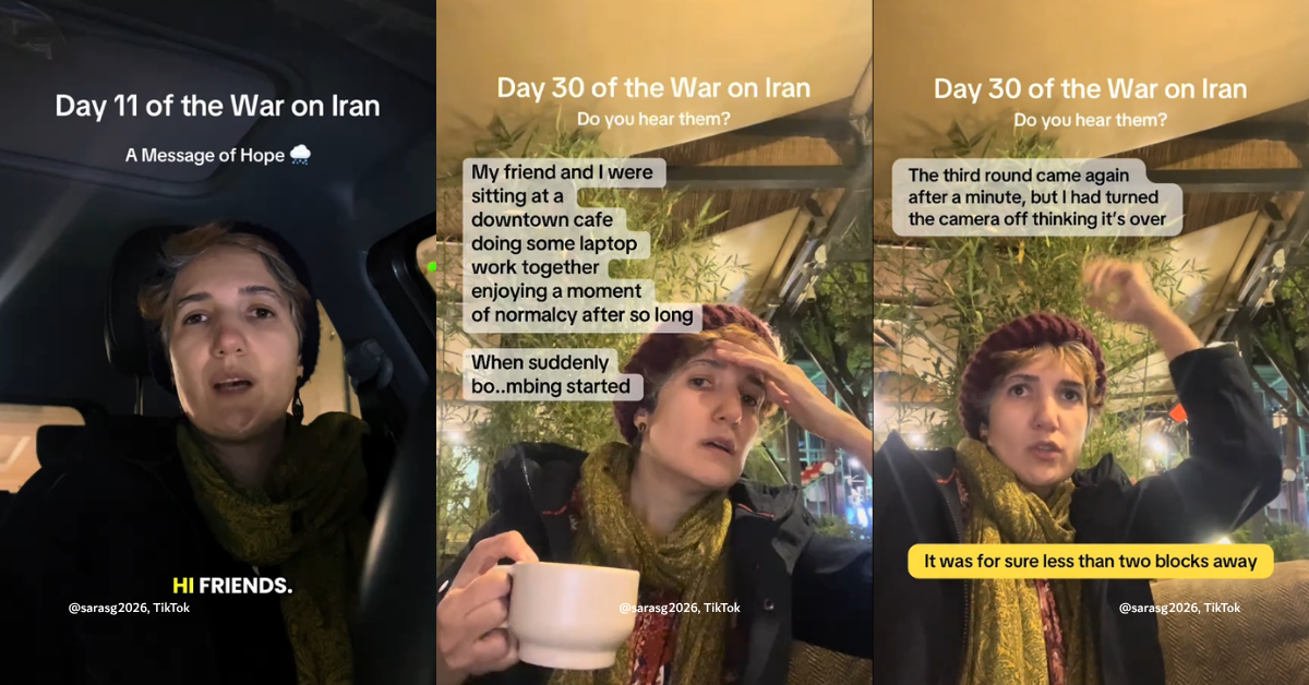 As bombs fell over Tehran and smoke from burning oil reserves choked the city, one woman turned to TikTok to document what life looked like from inside the war. Posting under @sarasg2026, TikTok creator Sara in Tehran has been sharing video diaries of what she describes as her experience living through the conflict in Iran.