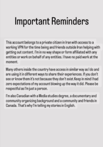 She explained that she is a private citizen in Iran with access to a functioning VPN, and that friends outside the country have been helping her upload content. She also stressed that she is not affiliated with any government, organisation, or political entity.