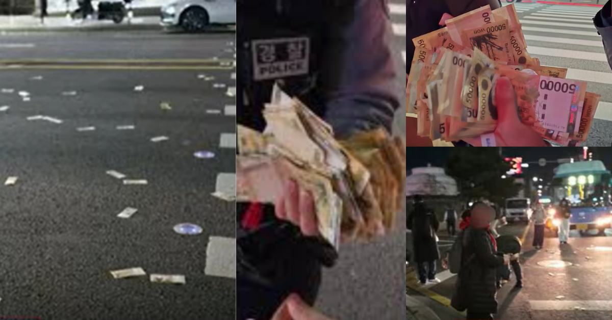 A social media user, known as A, wrote, “I saw a 50,000 won note on the ground and then noticed many more. The whole road was full of cash.”