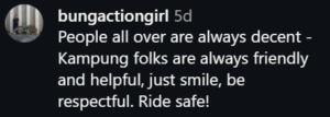“Kampung folks are always friendly and helpful,” one commenter wrote. “Just smile, be respectful. Ride safe.”